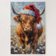 This textured impressionist oil painting captures a shaggy Highland Cow, wearing a tinsel-covered Santa hat atop its horns, standing patiently in a field of frosted winter heather. A rustic and warmly colored holiday design.