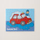 Personalizado de un hombre en forma azul lavando la mano con un auto rojo. Texto personalizado.