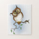 Pequeño búho lindo con la cabeza inclinada, charlando.