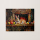 Conejo de Pascua sentado frente a la chimenea con coloridos huevos de Pascua