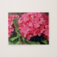 La fotografía original de MaeFlowers en este rompecabezas es un closet de hortensias rosadas y sus hojas verdes de primavera con un borde irregular. La pompa central de pétalos de flores casi llena la foto, rodeada por las hojas verdes y trozos de otras pompas de flores a cada lado.