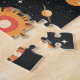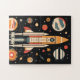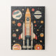 Un vibrante ilustracion retro-temático de un clásico barco de cohetes volando al espacio, rodeado de planetas coloridos, estrellas y elementos cósmicos. el diseño usa rojos, tés y naranjas audaces contra un fondo estelar oscuro, evocando la estética de ciencia ficción de mediados de siglo. Esta obra de arte caprichosa y nostálgica es ideal para los niños. La mejor parte de este rompecabezas es que puedes personalizar con el nombre de tu hijo.