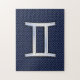 Un cromo plateado como el símbolo zodiaco Gemini se aplica sobre un fondo de impresión de textura de diseño de fibra de carbono azul marino. Un diseño de arte urbano moderno para una gran idea de regalo de cumpleaños personalizado.
