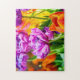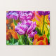 Flores de tulipán de loro morado asombrosas en primavera. Colores vibrantes. Belleza y encanto de la temporada primavera. Una flor colorida en el mágico jardín para agradar a tus ojos y calentar tu corazón. Este hermoso rompecabezas de 252 piezas sería muy divertido juntar y hacer una decoración elegante para su casa o oficina. Se puede transferir este diseño a una variedad de otros productos, en particular una estampada de tela estirada, obras de arte metalizado o de madera, paneles murales, tarjetas planas, tarjetas postales, etc.