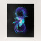 Símbolo infinito con mariposa mágica, morada brillante con alas transparentes, sobre fondo negro. Mariposa brillante.