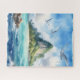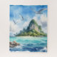 Isla misteriosa en medio del océano rodeada de gaviotas. ¿Y son esas casas que veo en el borde de la jungla? Al estilo de un cuadro acuático.