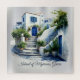 Imagen acuarela de una escena de la isla de Mykonos, Grecia. Un fondo blanco satinado completa el conjunto.