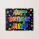 Este animado y vibrante diseño de rompecabezas con temática de cumpleaños presenta el mensaje "FELIZ CUMPLEAÑOS, JARED" con los personajes con un colorido patrón de degradado inspirado en el espectro de arcoiris, junto con un emocionante patrón de fondo de las formas de estrella. Un puzzle vibrante como este podría ser una manera divertida de enviar saludos de cumpleaños a alguien llamado Jared. [~Z0000468]