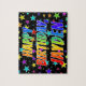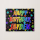 Este vibrante, emocionante y excitante diseño de rompecabezas con temática de cumpleaños tiene el mensaje "FELIZ CUMPLEAÑOS, JAYDEN" con los personajes con un colorido patrón de gradiente inspirado en el espectro de arcoiris, además de un divertido patrón de fondo de estrellas. Un rompecabezas vibrante como este podría ser usado para enviar un mensaje de bienvenida de cumpleaños a alguien llamado Jayden. [~Z0000468]