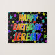 Este excitante y vibrante diseño de rompecabezas con temática de cumpleaños tiene el mensaje "FELIZ CUMPLEAÑOS, JEREMY" con los personajes con un colorido patrón de gradiente inspirado en el espectro de arcoiris, junto con un divertido campo de patrones de fondo de estrellas. Un colorido rompecabezas como este podría ser usado para enviar un mensaje de bienvenida de cumpleaños a alguien llamado Jeremy. [~Z0000468]