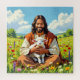 Christian religious puzzle.  with an ai illustration of Jesus Christ holding a lamb and smiling.