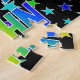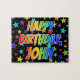 Este emocionante y divertido diseño de rompecabezas con temática de cumpleaños muestra el mensaje "FELIZ CUMPLEAÑOS, JOHN" con los personajes con un colorido patrón de gradiente inspirado en el espectro de arcoiris, junto con un dinámico patrón de fondo de campo estrella. Un rompecabezas colorido como este podría ser usado para enviar saludos de cumpleaños a alguien llamado John. [~Z0000468]