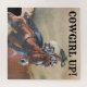 Una vaquera en un gorra vaquero está a caballo por un paisaje occidental abstracto. Cowgirl Up se escribe en la parte superior en una fuente vintage.Esto se puede cambiar a un nombre o frase favorita.