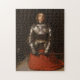 Este diseño presenta una pintura del artista inglés Sir John Everett Millais, que fue uno de los fundadores de la Hermandad Previolácea. Es un retrato poderoso e introspectivo de la heroína francesa, capturándola en un momento de profunda conexión espiritual. Pintado en 1865, este trabajo ejemplifica la dedicación de Millais a los detalles, la precisión histórica y la profundidad emocional. Juana de Arco es retratada arrodillada en el interior de una habitación revestida de madera, vestida con un traje de armadura. El entorno es sencillo y la atención se centra en la propia Joan. La armadura, reproducida con precisión meticulosa, luce con una capa metálica, destacando la habilidad de Millais para capturar la textura y el peso del material. Esto contrasta con la cara joven y serena de Joan, que está iluminada suavemente, enfatizando su pureza interior y devoción. La postura de Joan es de humildad, sumisión, religiosidad y rezo; se arrodilla en un piso de piedra, con las manos apretadas alrededor del cordón de una espada que ella sostiene justo delante de ella. La espada, símbolo de su misión divina y de su papel marcial, es central en la composición. La mirada de Joan se dirige hacia arriba, sus ojos se llenan de una mezcla de determinación y fervor espiritual, como si estuviera recibiendo la orientación de Dios en los cielos de arriba. La paleta de colores de la pintura es sobria, con tonos suaves que realzan la solemnidad de la escena. El fondo oscuro sirve para atraer la atención del espectador hacia Joan, creando una atmósfera íntima, casi sagrada. El juego de la luz y la sombra a través de su armadura y su rostro añade profundidad y dimensión a la obra, haciendo que Joan parezca físicamente anclada y espiritualmente elevada. La representación de Millais de Juana de Arco es tanto un tributo a su significado histórico como una meditación sobre los temas de fe, deber e inspiración divina. La pintura resuena con una sensación de fuerza tranquila y determinación inquebrantable, retratando a Joan no sólo como guerrera, sino como una joven mujer profundamente conectada con su vocación espiritual. A través de esta pintura, Millais ha capturado la esencia misma del carácter de Joan: su valentía, su piedad y su disposición a cumplir su misión que Dios le dio.