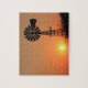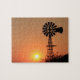 Un Sunset naranja de Kansas dorado que es brillante y colorido con una silueta de molino de viento al norte de Hutchinson Kansas USA. Eso está en un PUZZLE.