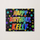 Este vibrante, animado, diseño de rompecabezas con temática de cumpleaños presenta el mensaje "FELIZ CUMPLEAÑOS, KELLY" con los personajes que tienen un coloreado patrón de gradiente inspirado en el espectro de arcoiris, además de un divertido campo de patrones de fondo de estrellas. Un rompecabezas colorido como este podría ser una manera divertida de enviar deseos de cumpleaños a alguien llamado Kelly. [~Z0000468]