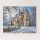 Hermosa representación artística del imaginario castillo francés abandonado en invierno con obras de piedra ornamentadas, chimeneas y torrecillas cubiertas de nieve.