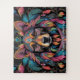 Esta vibrante obra de arte muestra una llamativa representación de un perro representado en un elaborado estilo de mosaico, que recuerda a las tradiciones bohemias y folclóricas. Las baldosas de colores ricos en tonos azul cobalto, naranja feroz, rojo profundo y amarillo dorado crean una expresión canina de color natural y conmovedora. Rodeada de intrincados patrones florales y mandala, la pieza irradia calidez, creatividad y fusión cultural. Envuelto en un fondo negro, los colores vivos y los detalles ornamentales se reviven, celebrando tanto el espíritu del animal como el arte de la artesanía de mosaicos.