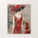 Una mujer de un collage de medios mixtos de vestimenta roja usando una efeméera vintage de IA