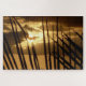Atardecer frente al césped de la playa. Maravillosos tonos dorados y marrones hacen de esta foto de puesta de sol un rompecabezas complicado dependiendo del tamaño y las piezas que elijas.