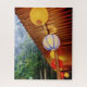 Rain gathered on the corrugated metal roof above, spilling in steady streams over the edge, while paper lanterns glowed softly in the damp afternoon light. Their warmth reflected against the rain and carried color into the lush jungle below.