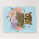 Pequeña lechuza marrón, adornada con flores de primavera color rosa pastel, melocotón y violeta, en un fondo azul claro