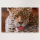 Con una impresionante vista de un leopardo limpiando sus patas en el suelo. Esta es una hermosa foto en este rompecabezas.