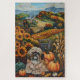 Celebra la belleza de la caída con esta vibrante pintura de un perro sentado al lado de una abundante cosecha de Acción de Gracias. Los ricos colores otoñales de las calabazas, los girasoles y el paisaje rústico de las casas de campo crean un ambiente cálido y acogedor, perfecto para cualquier amante de los perros con una decoración de temporada.