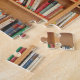 Libros en el estante. Un estante de madera en muchas diversas ideas del regalo para los aficionados a los libros y los grandes productos para los gusanos de libro.