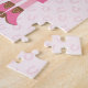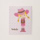 Custom jigsaw puzzle features a beautiful vector illustration of a little cowgirl on a pink horseshoes pattern background.