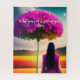 El rompecabezas colorido presenta el paisaje surrealista de una mujer que mira sobre un vasto prado rodeado de montañas con una flor púrpura central. Rumi busca la cita en el alfabeto moderno sobrepone el cielo. Imagen creada con software AI.