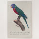Esta imagen llamativa se centra en una representación detallada del loríquet arcoíris, específicamente una hembra, conocida en francés como Perruche à tête bleue, femelle. El plumaje de colores vivos del ave capta inmediatamente la atención: una cabeza de un azul profundo con un fino detalle de plumas, contrastada por un pico naranja brillante y un ojo rojo intenso que añade intensidad a su expresión. La transición de la cabeza azul al cuerpo verde es suave y luminosa, ilustrando la característica apariencia multicolor de la especie.