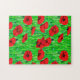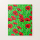 Rompecabezas en un patrón semiabstracto, acuarela de espías rojas en un campo, contra tallos y hojas verdes