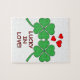 Afortunado en el amor. Dibujos de tréboles de cuatro hojas con formas cardíacas flotando sobre ellos.