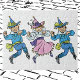 Historias clásicas de ilustracion vintage para niños, imagen de William Wallace Denslow, del libro de cuentos de la era victoriana El Maravilloso Mago de Oz de L. Frank Baum. Tres lindas munchkins bailando de la Ciudad Esmeralda divirtiéndose. ¡Los chicos están vestidos de azul y la bailarina chica está vestida con un vestido rosado y todos llevan gorras graciosos!