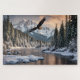 Un majestuoso águila calva sopla sobre un río en invierno, con árboles llenos de nieve y montañas glaciales en el fondo. Un rompecabezas perfecto para cualquiera que ame la vida salvaje, la naturaleza y el exterior.