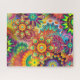 Desafiante rompecabezas con 520 piezas. Un diseño psicodélico abstracto con mandalas coloridas y estribos en naranjas, amarillos, azules, rosas, magenta, moradas y rojas. Hace una gran actividad nocturna familiar.