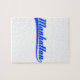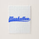 Manhattan, Nueva York, escrito con un swash (cola). Fuentes en blanco y azul. Diseño de texto original.