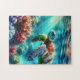 Rompecabezas temática de tortuga. Un ilustracion aéreo de una tortuga marina nadando en el océano.