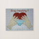 Mantente sano con un corazón rojo, máscara protectora y guantes de goma