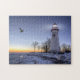 El histórico faro Marblehead se encuentra en el noroeste de Ohio, a orillas rocosas del helado lago Erie. Visto aquí en invierno con un colorido amanecer y nieve en el suelo.