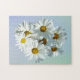 Un ramo de margaritas blancas con centros amarillos se presenta sobre un fondo azul pálido. Las margaritas blancas representan pureza e inocencia con su apariencia fresca.