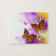Naranja, mariposas monarcas detalladas sobre la luz, púrpura, pintoresca, fondo pintado.