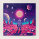 Un astronauta se alza sobre un paisaje foráneo rocoso y rojo bajo un cielo vibrante lleno de planetas y estrellas. La escena es surrealista, con un gran planeta brillante que domina el horizonte.