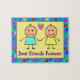 Rompecabezas colorido y lindo de dos mejores amigas para siempre. El enfoque principal son dos niñas, una con un vestido azul y otra con un vestido amarillo. Entre ellas hay un lindo corazón de amor rosa. Están dentro de un rectángulo amarillo enmarcado con un marco de lunares multicolores.
