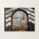 El sol y la sombra de las rayas de pintura en el arco de una tumba receptora en ruinas a través de la cual se puede espiar una escena otoñal en esta foto tomada por Richard H. Fay.