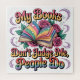 Un diseño retro vibrante y colorido muestra un libro abierto, rosas, formas de media luna y estrellas. El texto en negrita dice: "Mis libros no me juzgan, la gente sí". Este diseño único está disponible en una amplia gama de productos.