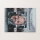 Rompecabezas conmemorativos con una foto de su ser querido contra una foto de un lago forestal en un día nublado. En la memoria amorosa está escrito encima de la foto junto con el nombre y años de vida de tu ser querido.
