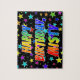 Este emocionante y divertido diseño de rompecabezas con temática de cumpleaños muestra el mensaje "FELIZ CUMPLEAÑOS, MISTY" con los personajes que tienen un coloreado patrón de gradiente inspirado en el espectro de arcoiris, además de un dinámico patrón de fondo de campo estrella. Un rompecabezas vibrante como este podría ser usado para enviar un mensaje de bienvenida de cumpleaños a alguien llamado Misty. [~Z0000468]