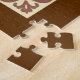 Puzzle of a Cupcake with mocha frosting topped with chocolate covered coffee beans, in a decorative, chocolate brown and tan cupcake wrapper, on a light chocolate and beige lace patterned background